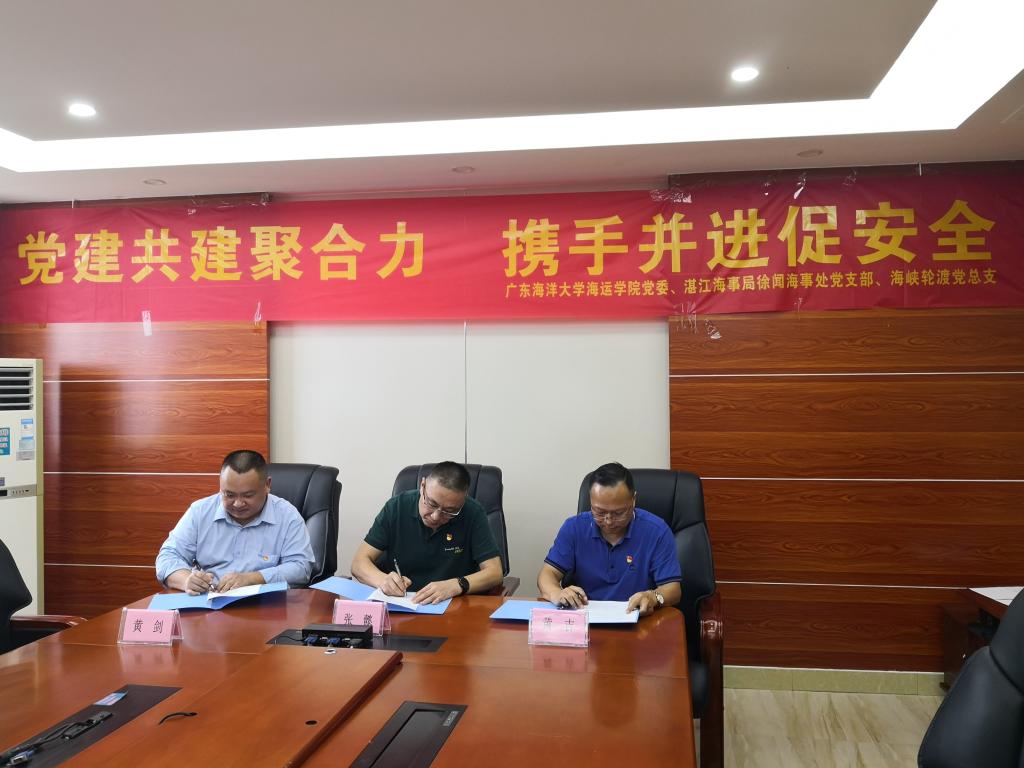 原党建共建协议由航海学院实验教学中心教工党支部、湛江海事局徐闻海事处党总支、海南海峡航运股份有限公司信海船队党总支签订,现已形成了互带互动、优势互补、资源共享、共同发展的校政企三方党建工作新格局,党建共建成果“校政企三方闭合联动,构建区域特色党建品牌”入选教育部第二届全国高校“两学一做”支部风采展示活动教师党支部推荐展示精品成果(全国共10件)。随着共建活动的不断深入、党建引领内涵式发展需要以及组织机构名称变更,三方决定在现有共建成果的基础上提升党建共建平台,重新签订三方协议,在科学研究、社会服务、人才培养等方面更加深入地开展共建,共同为“黄金水道”琼州海峡保驾护航。