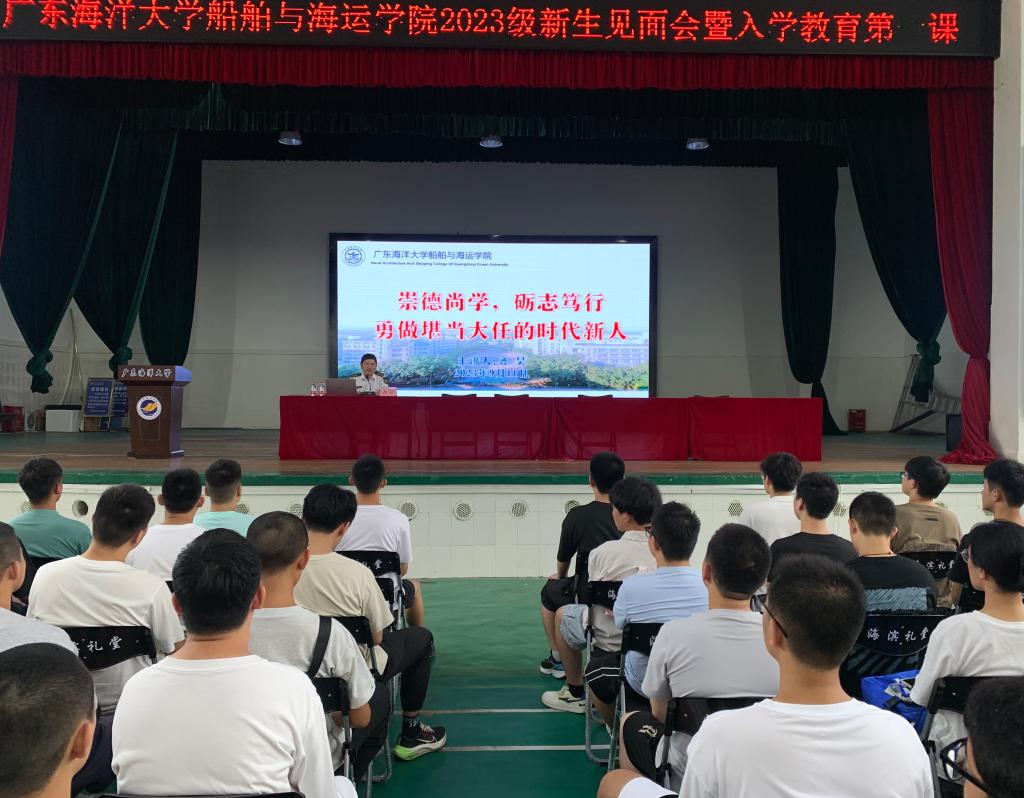 2023级新生见面会暨入学教育第一课在海滨校区礼堂举行。学院党委书记张懿、院长贾宝柱、党委副书记齐昊、副院长李荣辉、副院长袁剑平以及各系主任、全体学工人员、新生班主任和2023级全体新生等参加会议。会议由齐昊主持。