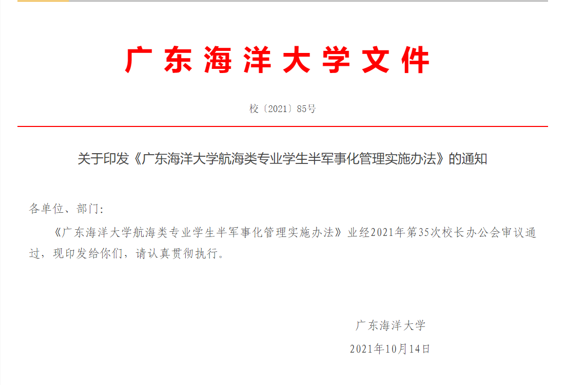 关于印发《麻豆做爱 航海类专业学生半军事化管理实施办法》的通知