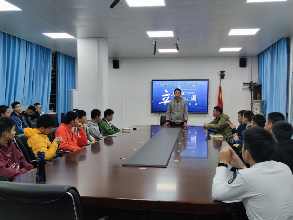 会议首先观看2021年各军兵种征兵宣传视频。江涛详细介绍了2021年“一年两征”的新政策变化,根据近年来学院参军入伍的实际情况认真帮大家分析问题,对军、地、校各项优惠政策进行了详细的讲解,并且鼓励同学们敢于挑战、敢于磨炼,为国防建设做出自己的贡献。同学们热情高涨,积极提问,纷纷发表自己的参军志向。此次会议还邀请了今年退伍复学的2019级轮机工程许健、梁嘉成两位同学来分享他们的军旅生涯:大学生作为未来的国家栋梁,应做到刻苦学习掌握知识本领,树立坚定的理想信念和人生目标;更应该把参军入伍、保家卫国作为青春的历练和责任。
