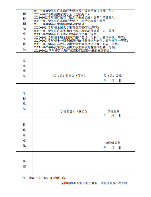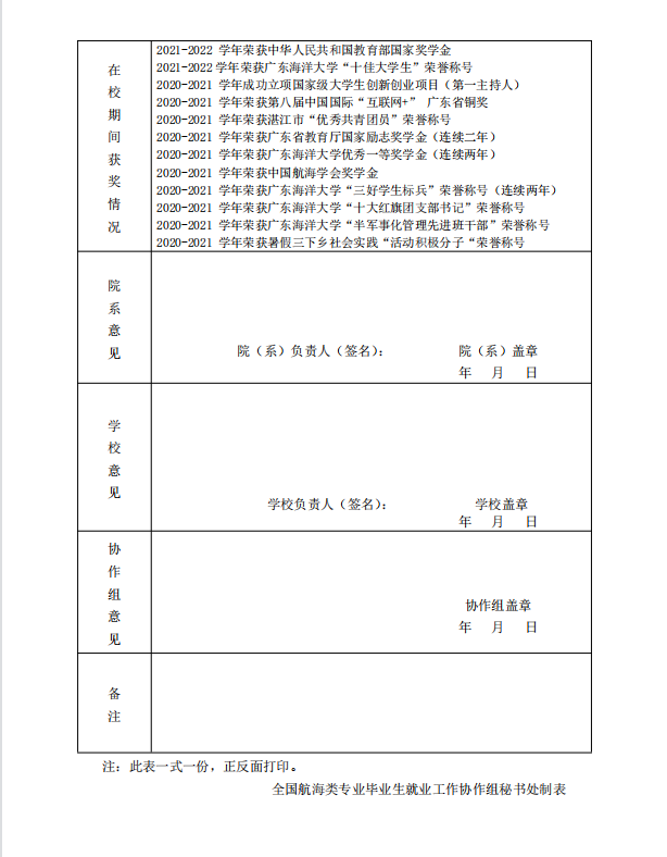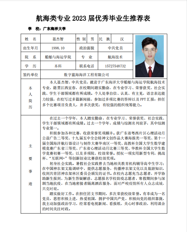 通过组织航海类专业毕业生个人申报、材料审查和会议讨论推荐,最终确定推荐航海1191班聂杰智和轮机1191班徐茂栋两名同学,现予以公示。
