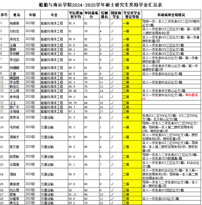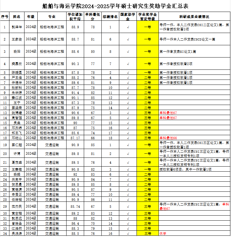 全日制研究生奖助学金实施办法》(校研究生〔2021〕34号)执行,经个人申请、班级复审、学院评审小组认真审核及严格评选,拟确定获得研究生助学金、学业奖学金人员名单。其中,2023级交通运输专业吴浪涛同学因休学,其奖助学金待复学后予以补发。现将评审结果进行公示(详见附表)。