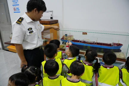 最后,小朋友们步入航海船模室。各式各样精美的船模让人目不暇接,志愿者向小朋友们介绍不同船模的类型和用途,比如集装箱船能装载大量货物,在世界各地运输物资。小朋友们兴奋地在船模间穿梭,仔细观察每一个船模,对航海运输有了更直观、更深刻的认识。